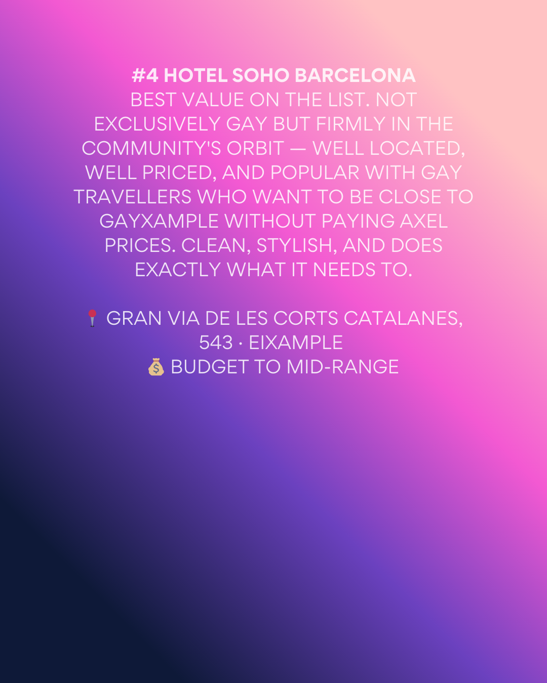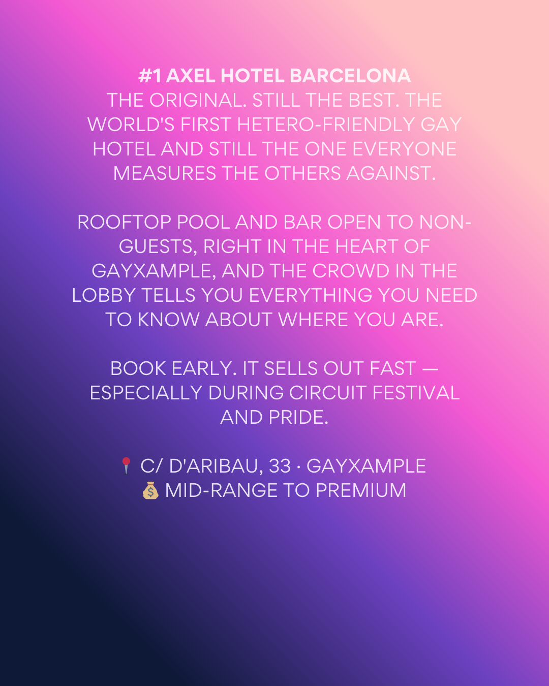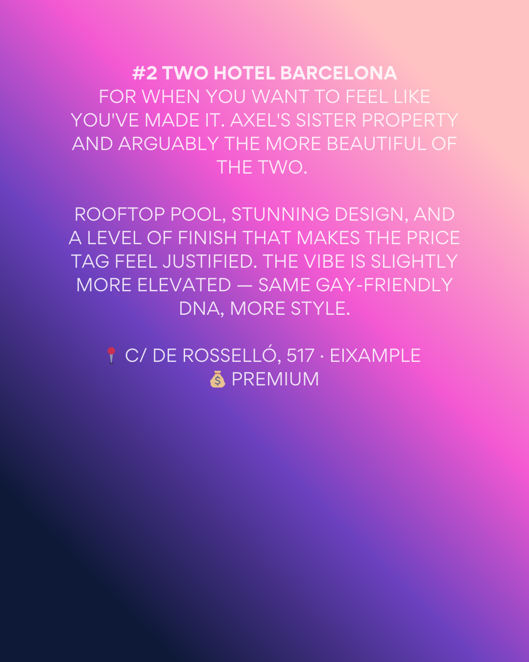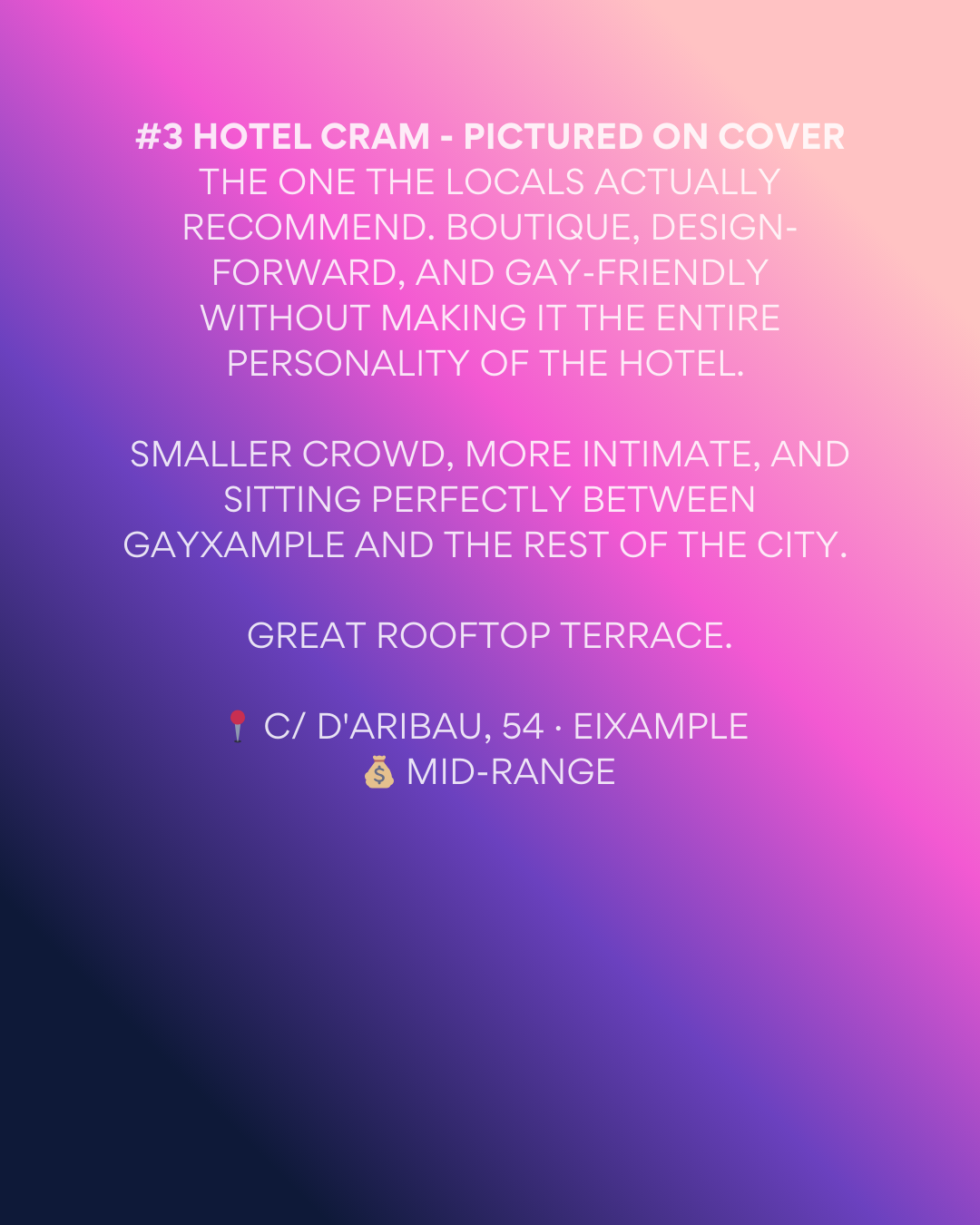 Rooftop pool, stunning design, and a level of finish that makes the price tag feel justified. The vibe is slightly more elevated — same gay-friendly DNA, more style.