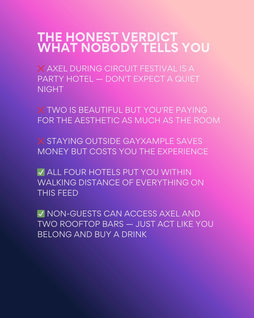 Book early. It sells out fast — especially during Circuit Festival and Pride.