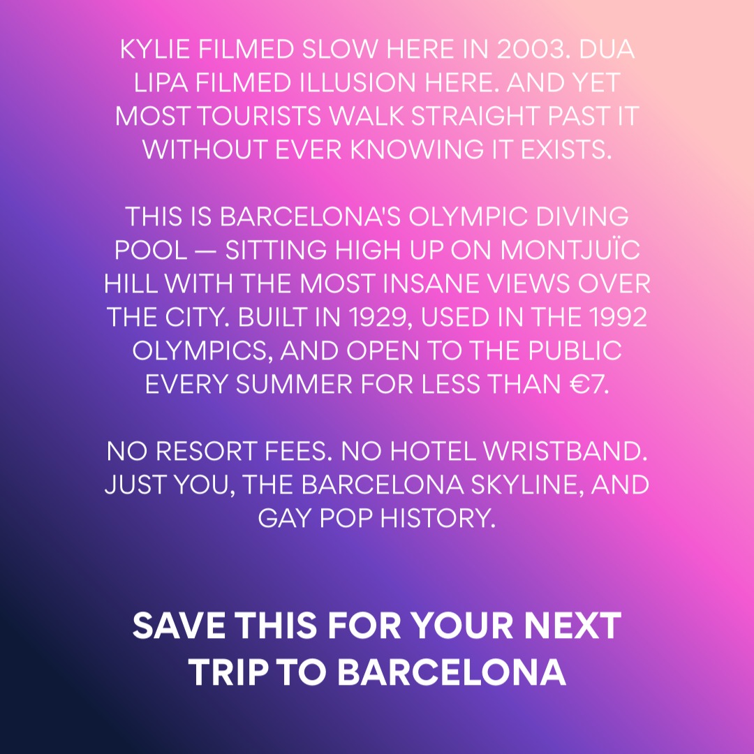 This is where Kylie Minogue filmed the music video for Slow in 2003. It's also where Dua Lipa filmed Illusion. Two of the most celebrated pop artists in gay culture, drawn to the same pool — and yet most tourists visiting Barcelona have absolutely no idea it exists.