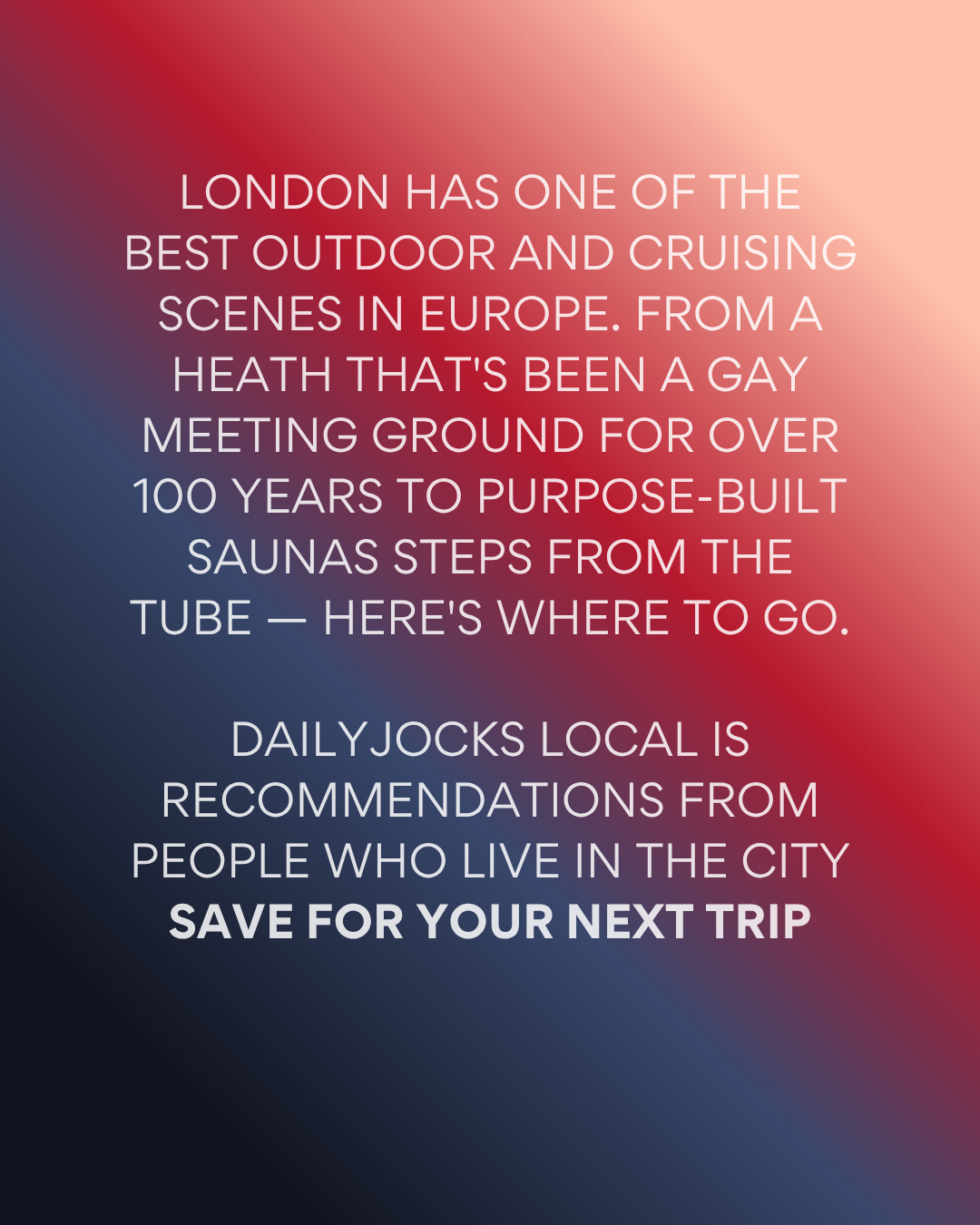 London has one of the best gay cruising and outdoor scenes in Europe. Most visitors only scratch the surface — they find one sauna, hear about the Heath, and leave not knowing half of what the city has to offer. This guide covers everything: the outdoor spaces, the purpose-built saunas, the cruise clubs, and the spots that don't advertise themselves but that every gay Londoner quietly knows about.