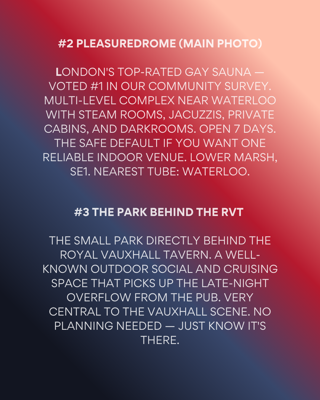 For visitors staying in Vauxhall — which we'd recommend as the best base for the gay scene — this is on your doorstep. No planning required. Just know it's there.