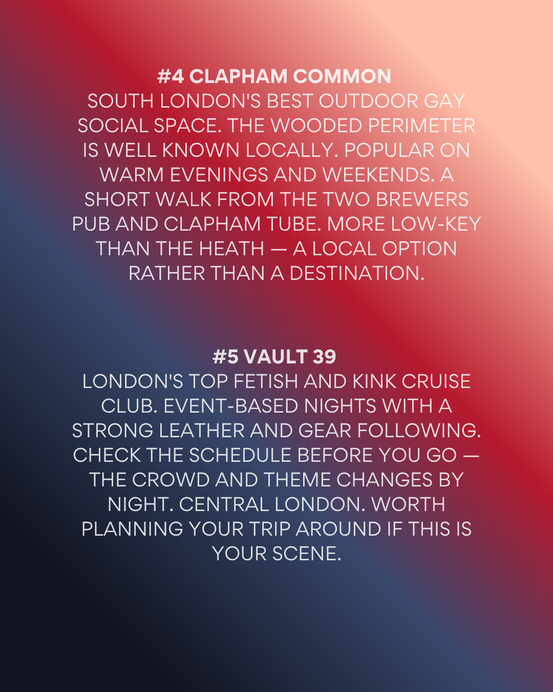 London's gay cruising and outdoor scene rewards visitors who do a small amount of research before they arrive. Hampstead Heath for the iconic outdoor experience. Pleasuredrome for the reliable indoor option. The park behind the RVT for Vauxhall's open secret. Clapham Common for south London's local scene. Vault 39 if gear and kink is your world. Brighton for a day out of the city.