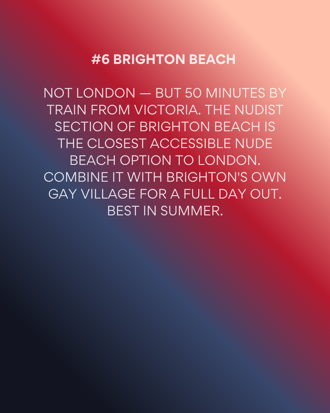 Brighton is a summer trip. The nude beach and outdoor scene in Brighton are genuinely excellent in summer. In winter, the beach is cold and the appeal is significantly reduced. Plan accordingly.