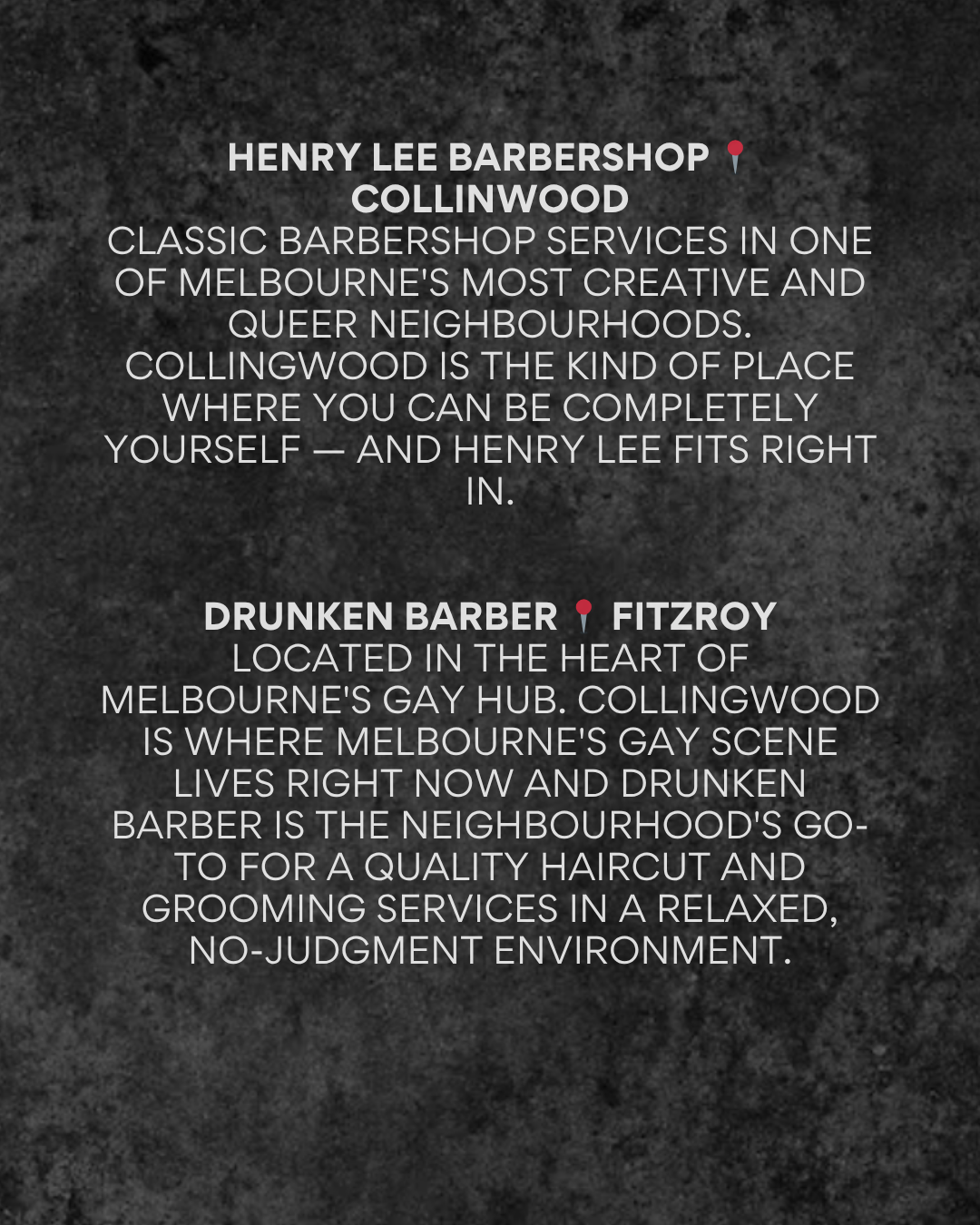 Collingwood has the best gay nightlife in Melbourne, a strong and visible queer community, and the kind of independent businesses that reflect the neighbourhood's character. Drunken Barber sits comfortably within that landscape, offering quality haircuts and grooming services in a relaxed, no-judgment environment that feels entirely at home in one of Australia's most progressive inner-city neighbourhoods.