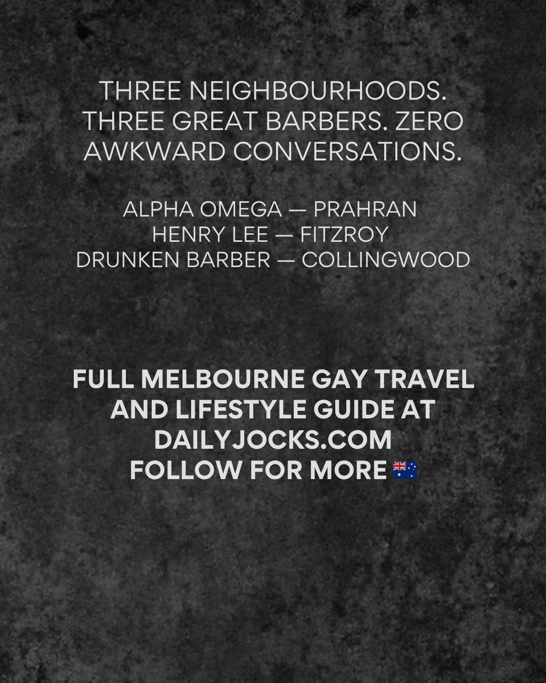 Prahran for a premium grooming experience combined with a visit to the DailyJocks store. Fitzroy for a classic barbershop cut in one of Melbourne's most creative and queer neighbourhoods. Collingwood for a relaxed, neighbourhood feel in the heart of Melbourne's gay scene.